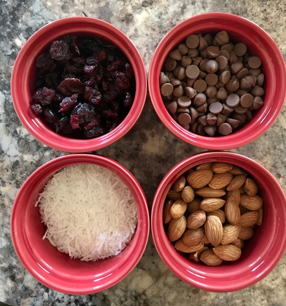 Now for the fun part! If you do not like anything boring (although the 3 ingredient cookie is delicious!) rummage through your cupboards and see what you can find. Mix the first 3-ingredients as indicated above, Then add handfuls of whatever you wish. There is no wrong combination. If you add too much, the cookie will be dry as the additions will soak up the moisture. So keep it simple. A handful of chocolate chips with 1 tbsp of nuts or pretzels. And so on.