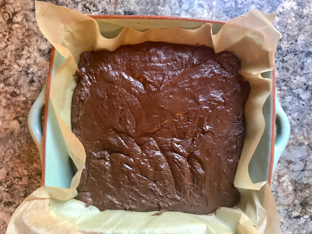 Working quickly now, line a square cake pan (I use 21 cm x 21 cm or 8″ x 8″) with parchment paper (wax paper is fine and if you don’t have anything else, use aluminum foil but spray it first with a bit of cooking spray) and pour the mixture in. (If you don’t have a cake pan close to this size, use any Rubbermaid or Tupperware square or rectangular container). Use a rubber spatula to try to smooth the fudge into the corners so that you have a fairly even top. If you spread the fudge out too thin on a cookie sheet or larger container, it tends to dry out quickly and is more like a chocolate bar and not what we are looking for. This fudge needs a good 2 cm or 3/4″ thickness in order to have a nice moist gooey fudge consistency!