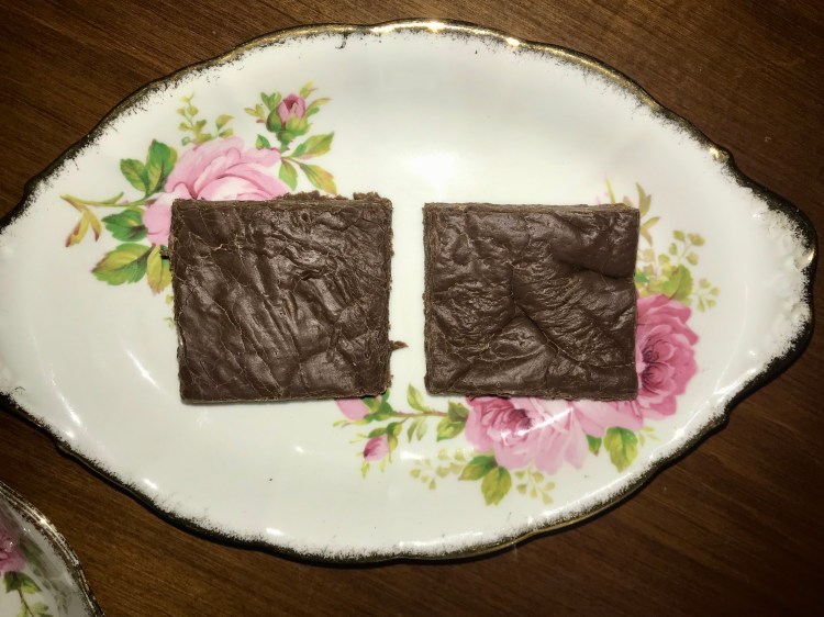 Allow fudge to cool and dry for a few hours. If your kitchen is warm and humid, this will take a few extra hours longer. The block of fudge will keep its shape as it dries in the pan and I usually lift it out of the pan using the corners of the parchment and place it on a cooling rack to speed the process along after about 2 hours. It should be ready to cut into pieces after about 3-4 hours. I just place the block on a cutting board with the parchment still under it and divide it into 9 pieces which I stack and package or display on a plate. If, when you first cut into the fudge, it is too soft to cut, let it dry another 1-2 hours.