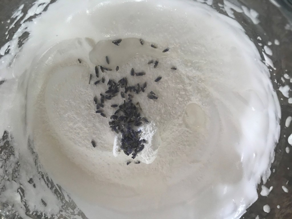Sift corn starch onto the meringue and add almond extract and dried lavender. Use a rubber spatula and gently fold these ingredients into the meringue.