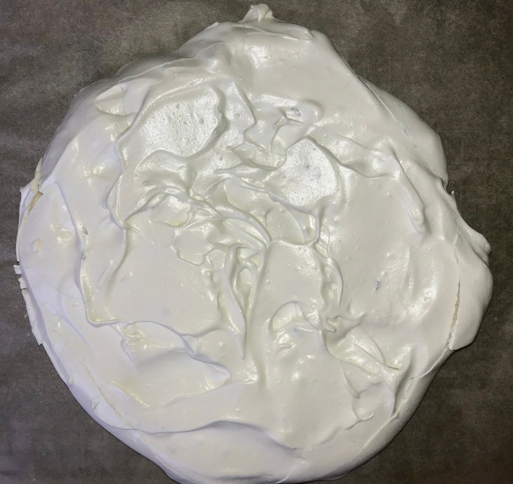 Cover a baking sheet with parchment paper and form the meringue in a circle approximately the size of a dinner plate. Bake for 2 hours then turn the oven off for another hour and leave the door shut so that the meringue can dry and cool.