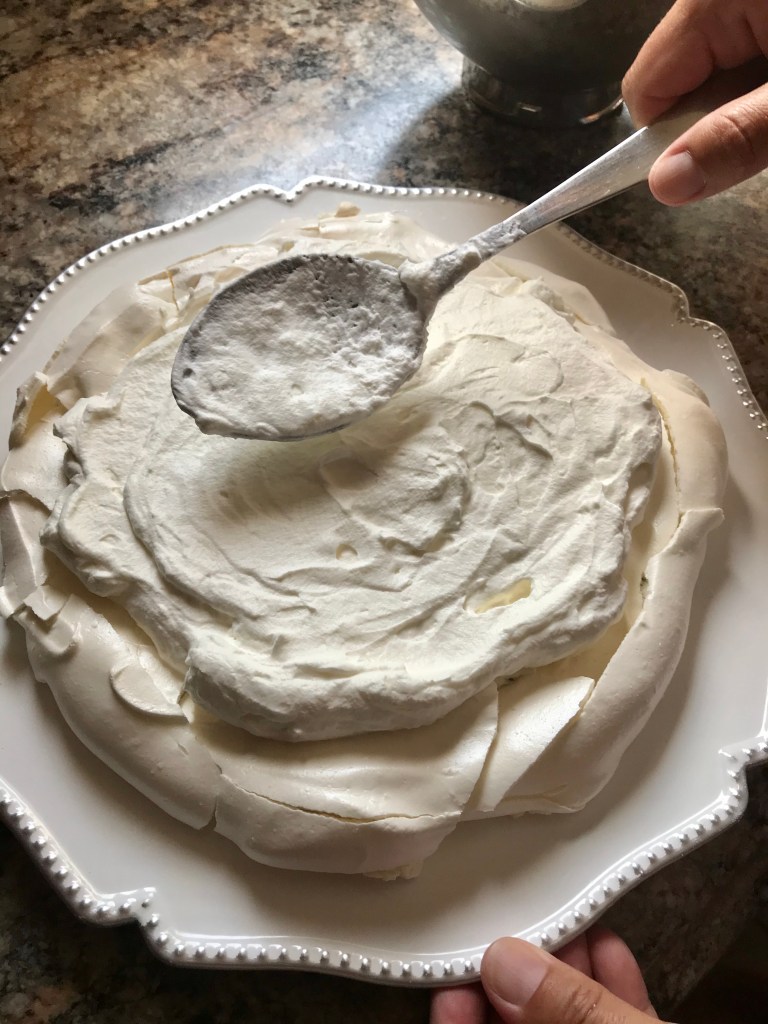 Spread the whipped cream on the meringue but leave the edges uncovered.