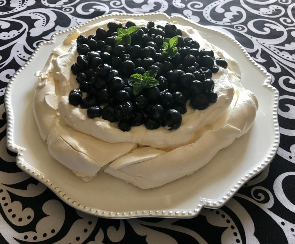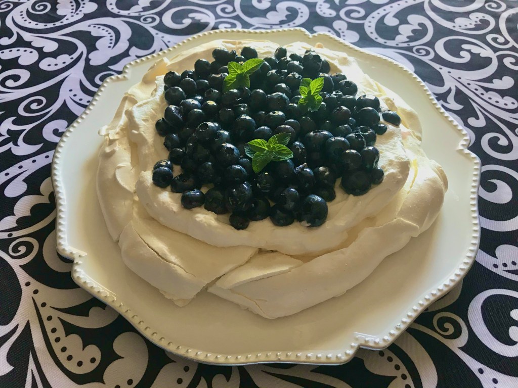 After the meringue has cooled off, it’s time to get your toppings ready. Rinse and dry 2 cups of blueberries. Add one tablespoon of liquid honey and a pinch of the dried lavender. Mix extremely gently, just so that the fruit is covered. Set aside so that the lavender can gently flavour the berries.