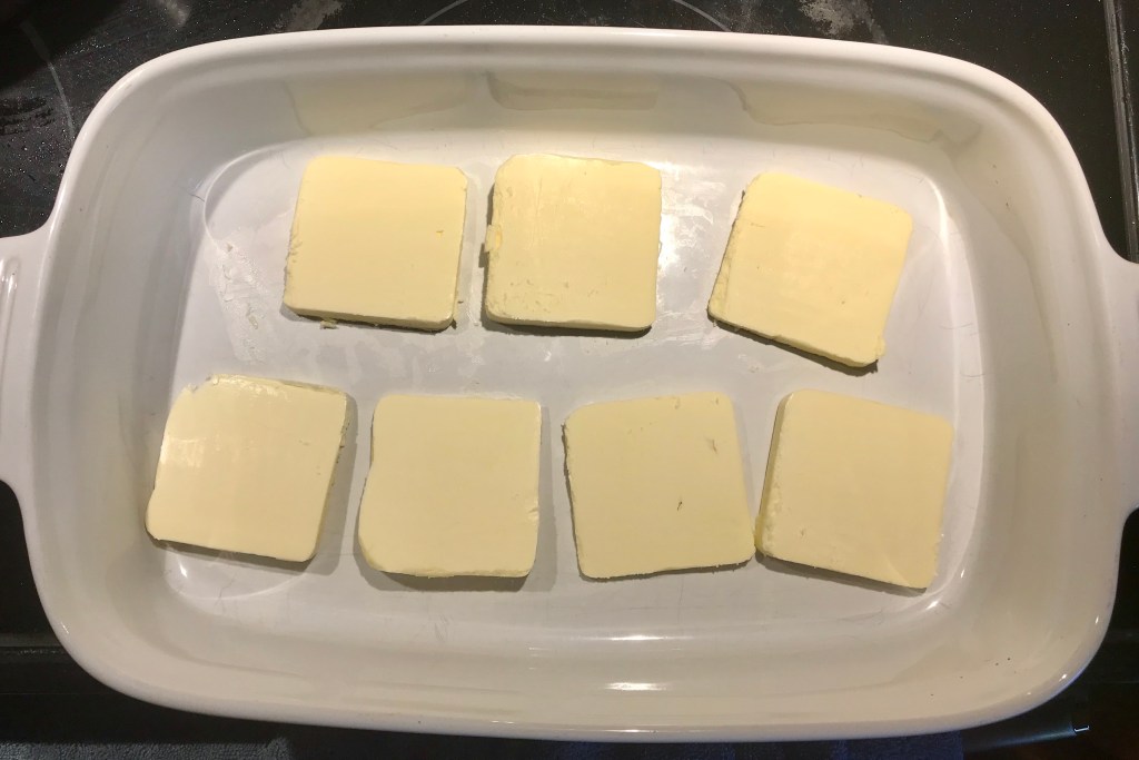 TURN ON OVEN TO 350 F. Slice the butter and place in baking pan. I am using a 9″ x 14″ pan here. Place the pan into the oven as it is preheating until the butter has melted. This only takes several minutes so keep an eye on your oven.