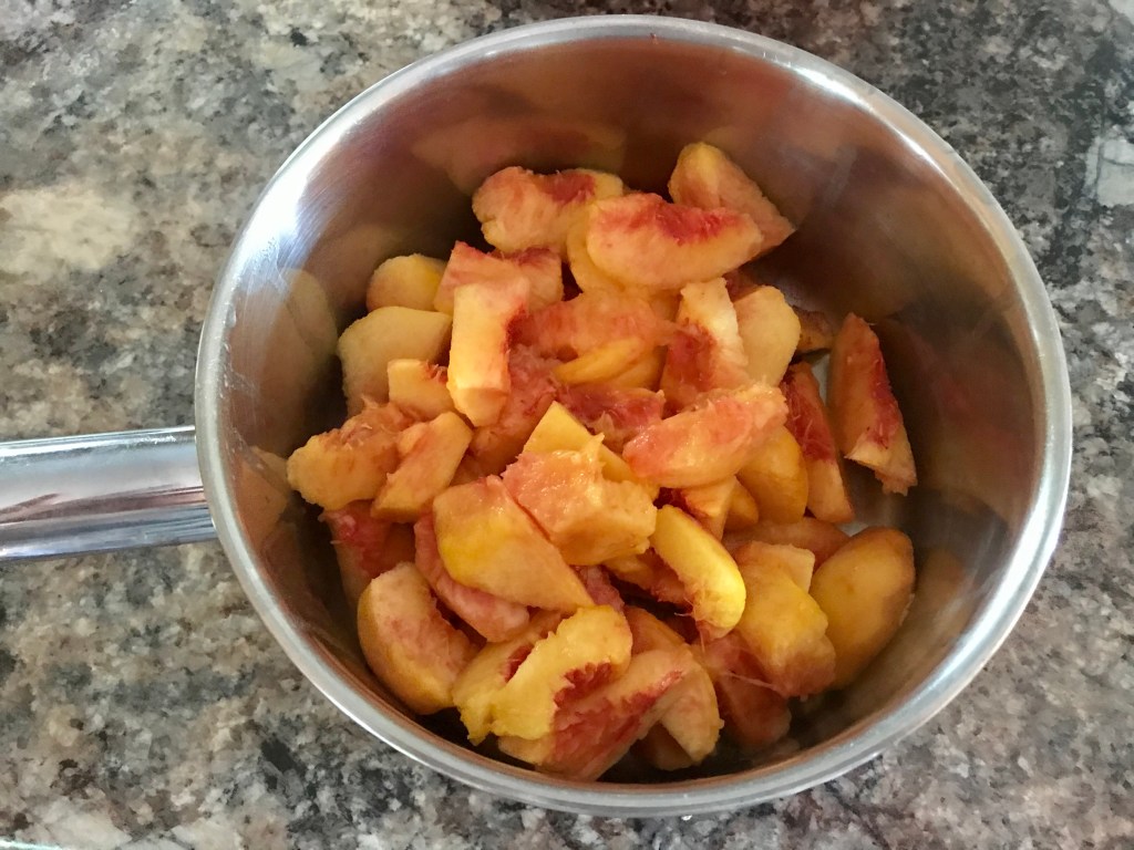 10-12 medium sized peaches – peeled and quartered. (The pieces do not have to be accurate. Ripe fruit is hard to cut)