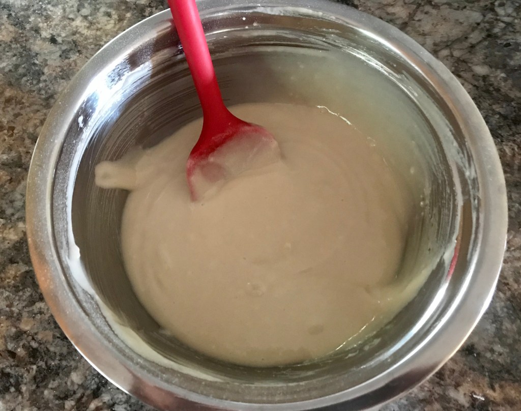 As you are waiting for the butter to melt, take a medium bowl and assemble the dry ingredients. Stir gently, just until mixed. Take 1 & 1/2 cups milk or cream and dissolve 1 tsp. vanilla into the dairy. Gently pour the liquid into the dry ingredients and mix with a rubber spatula.