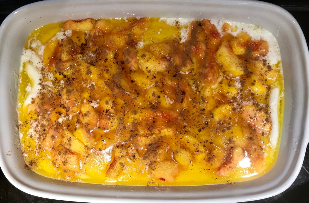 Spoon the peach mixture on top of the cobbler, fairly evenly and sprinkle lightly with just a little cinnamon.