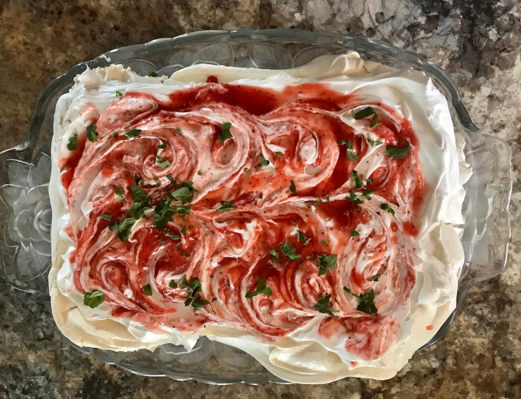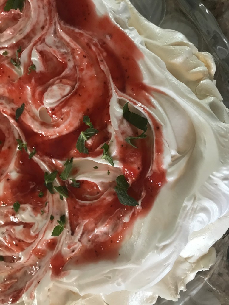 Same Pavlova recipe as last time, with a few modifications resulting in a light and summery dessert! With only meringue, whipped topping and some strawberry sauce/jam, this dessert is as light as a cloud!
