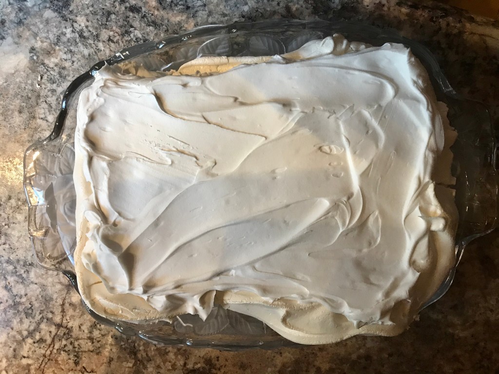Spread the dessert topping on the meringue base. Once that is spread evenly, take your dessert sauce and dribble it across the whipped topping. Then take the back of a spoon and work it in in swirls. There is no right or wrong answer here.