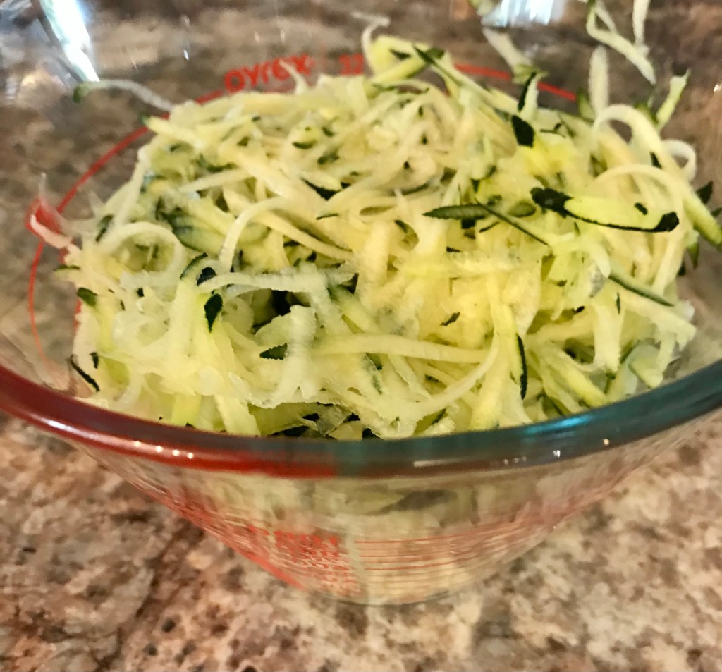 Grate the zucchini and set aside. You don’t need to cover it as you will be adding it to the batter in minutes. I use a box grater and use the coarse side. The strips of green from the skin add a nice colour to the batter and you want those in there.