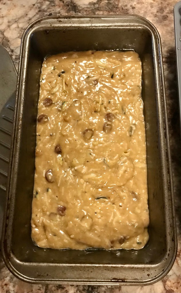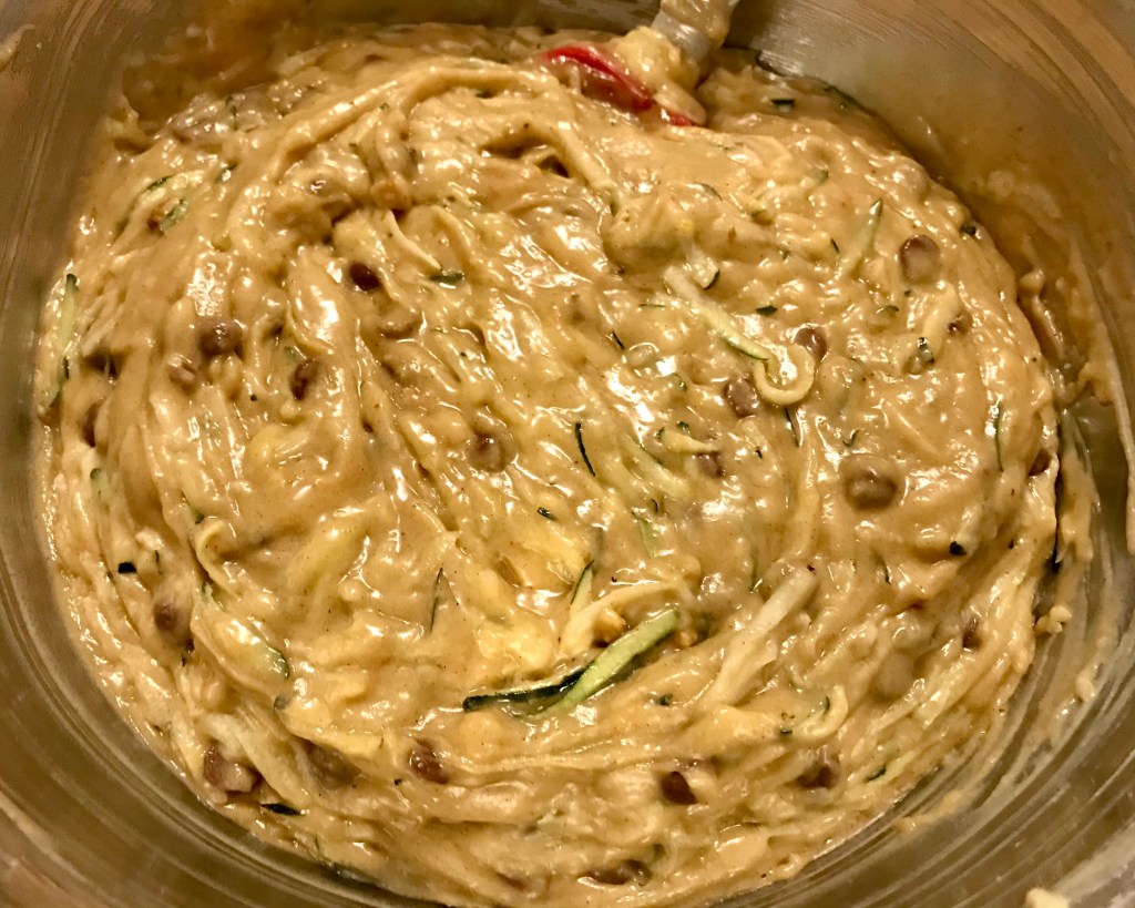 Fold the grated zucchini in gently and then add the chocolate chips and coconut, just stirring enough that they are folded into the batter.