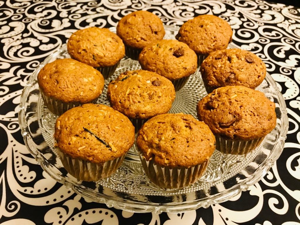 I used to peel the waxy skin off this large, green billy-bat looking fruit that people sometimes mistake for being a cucumber, but also belongs to the squash family. It smells like a pumpkin when you cut into it and the seeds look like gourd seeds. I also used to slice the zucchini length-wise and cut out the seeds. Now I just trim the ends off the zucchini and grate it with the skin on for bits of green (it is not tough but soft) making sure that I was only grating the white flesh and leaving the core and seeds undisturbed to be discarded. This is a no-fuss recipe, where the most effort is the grating of the zucchini. This recipes yields several loaves and muffins, is great to make ahead and freeze or to share with family and friends! Although the ingredient list is long, it is compiled of standard every day items you can easily purchase at your local grocery store.