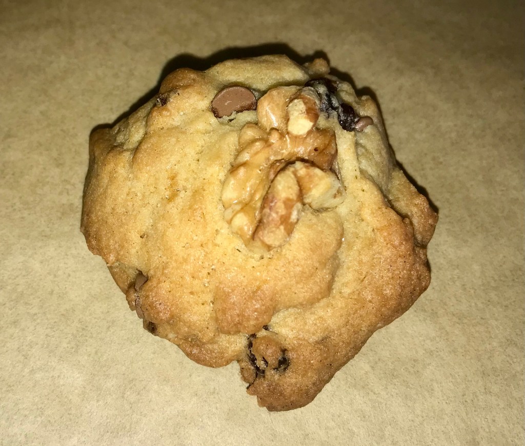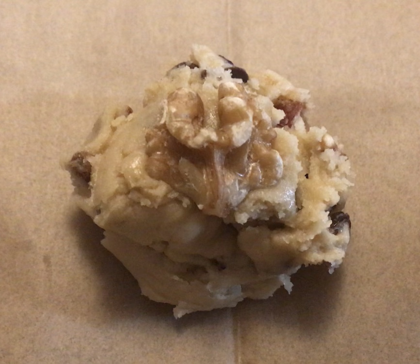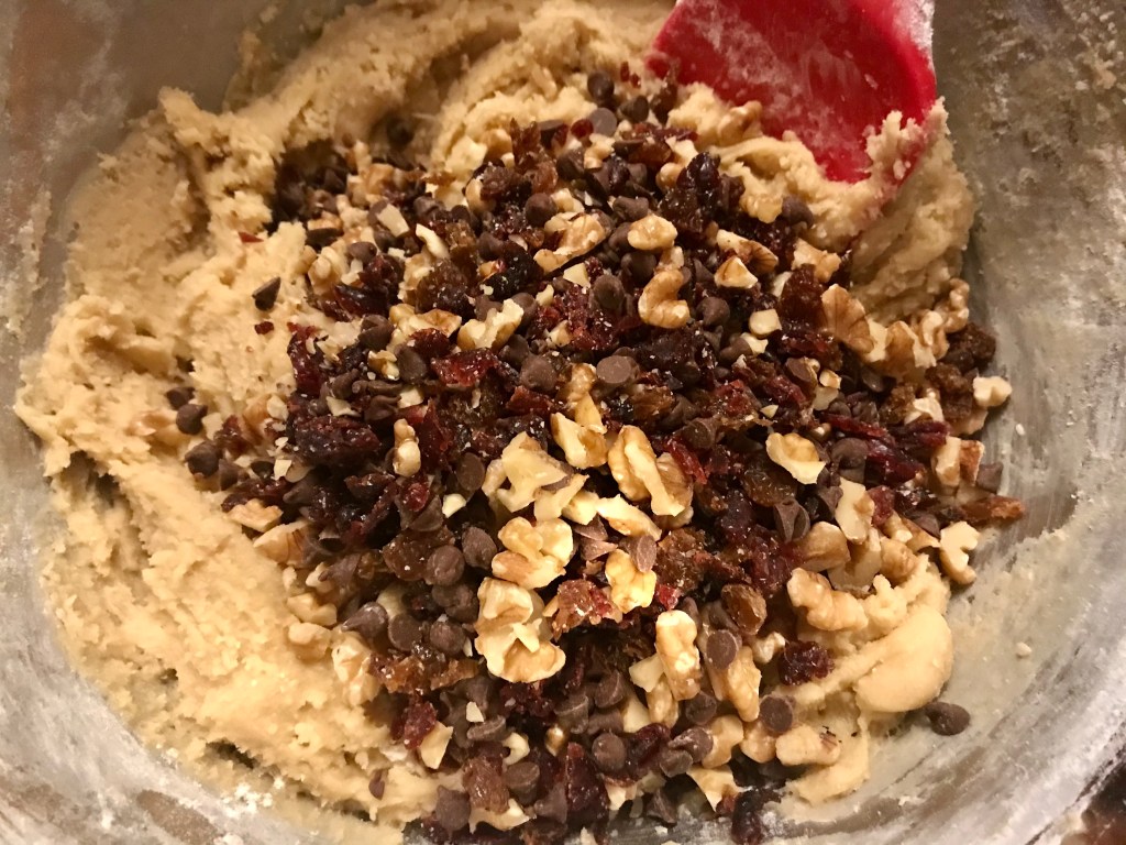 Chop up your walnuts into smaller pieces, cranberries and raisins as well. These should be so small that they soften and dissolve and bake into the cookie. They are more for flavour than texture.
