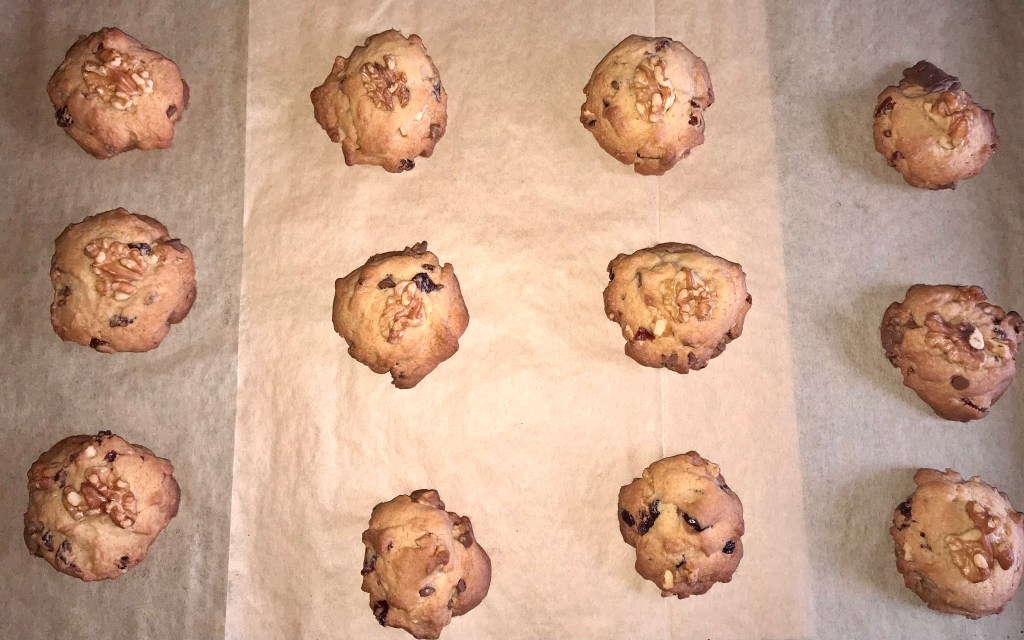 Everybody loves traditional Butter Pecan cookies. But I find that, unlike pecans, I have walnuts readily available in my cupboards at most times. So why not combine the buttery flavour with the crunchiness of walnuts and then add a bit of natural sweetness through cranberries and raisins?