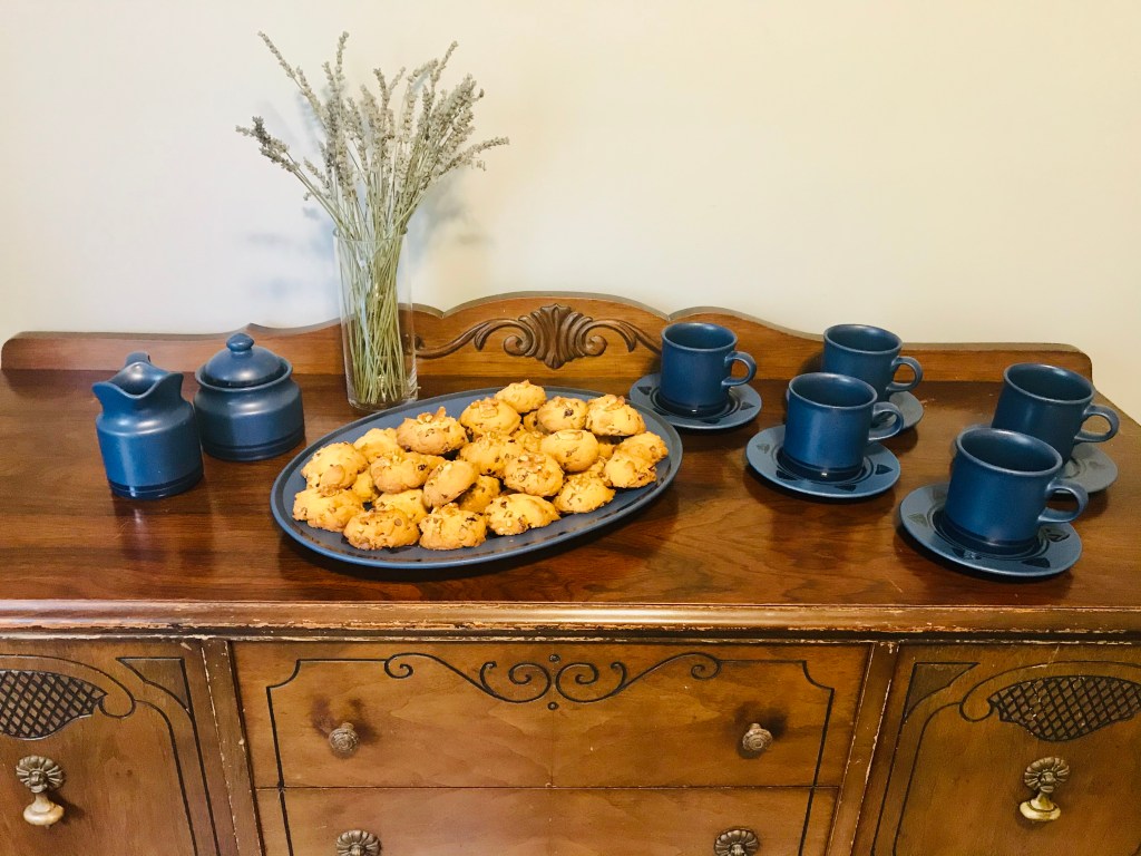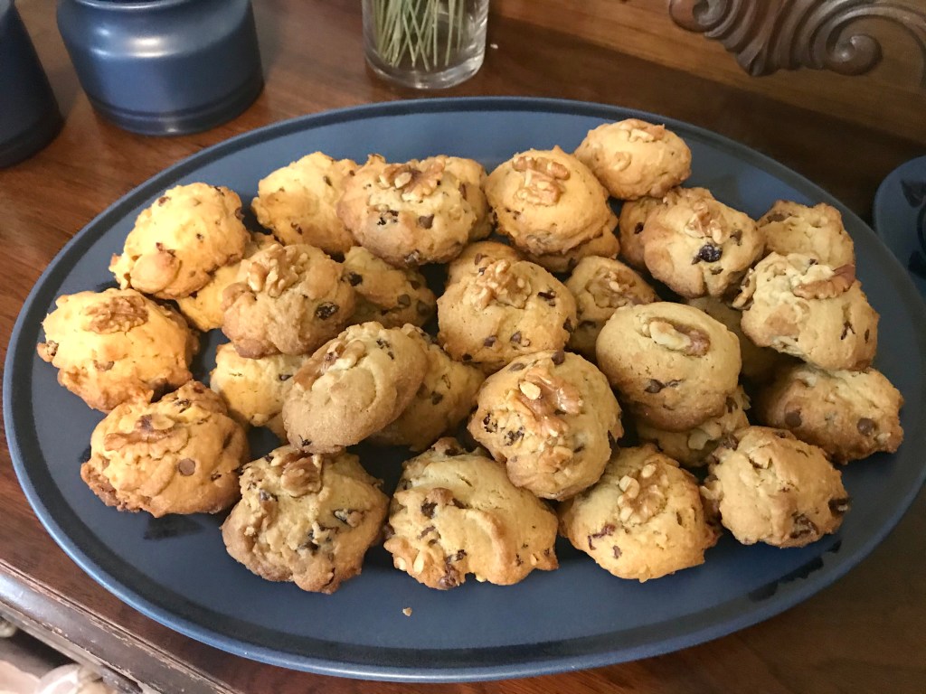 Line cookie sheets with parchment paper and drop about a tablespoom size onto prepared cookie sheets. Space them evenly. They will spread slightly. I also added a walnut piece to adorn each cookie to make it look nicer. Not everyone loves the extra walnut crunch. So sometimes it’s better to just bake without the extra chunk on top. I baked some sheets with the walnut on top and others without.