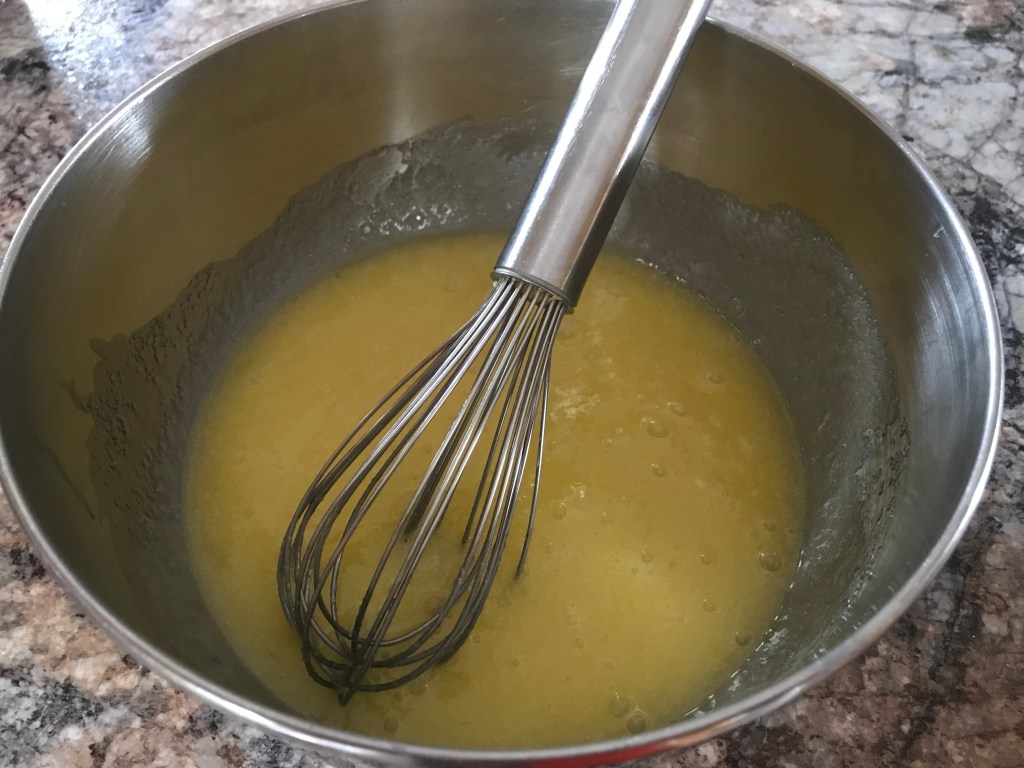 Combine the flour and baking powder and add to the mixture, using a rubber spatula to fold in and scrape the sides.