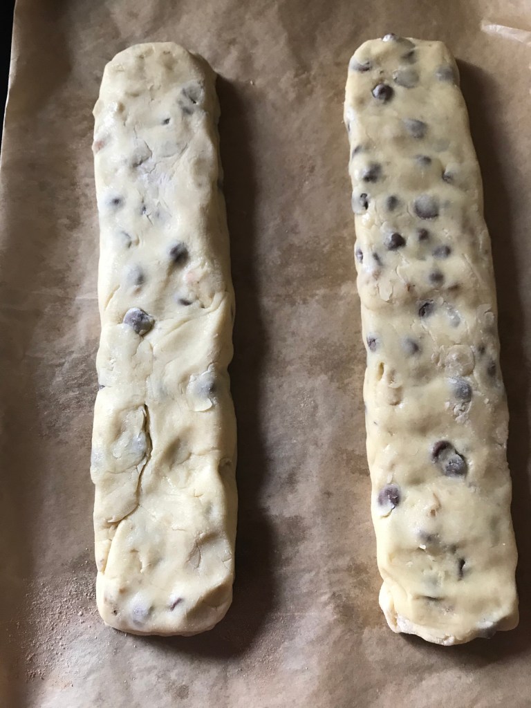 Cover a baking sheet with parchment paper. Sprinkle a little flour on your hands and the top of the dough. Take about half of the dough and shape it into a log on the baking sheet. Add more flour on your hands and take the rest to do the same. I make smaller biscotti so that they are daintier to serve. You can use all of the dough to make one large, long log. But this baking time is for two logs.