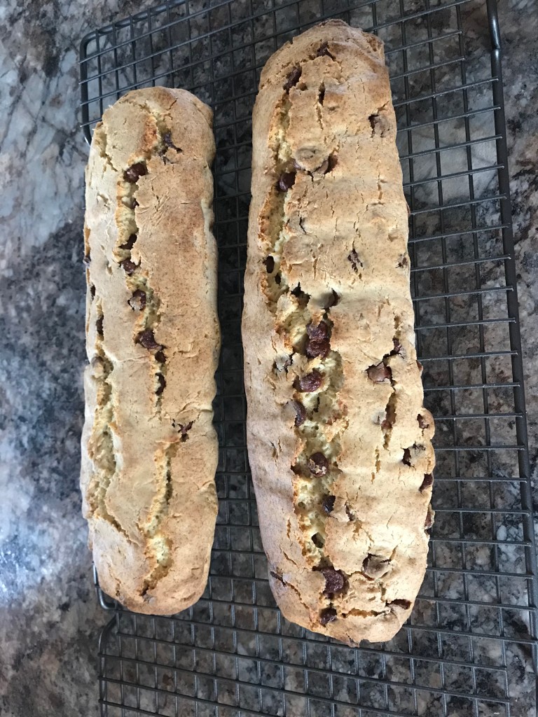Take the logs out of the oven and place on a cooling rack. I usually wait until they are fairly cool before cutting them. This can be half an hour or an hour later.