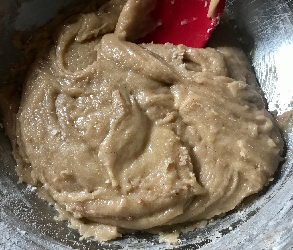 Add the vanilla. In a separate bowl, whisk the flour, baking soda and cinnamon together, then add to the wet ingredients all at once. Use a rubber spatula and work the dry and wet together to create a thick consistency. It won’t take very long.
