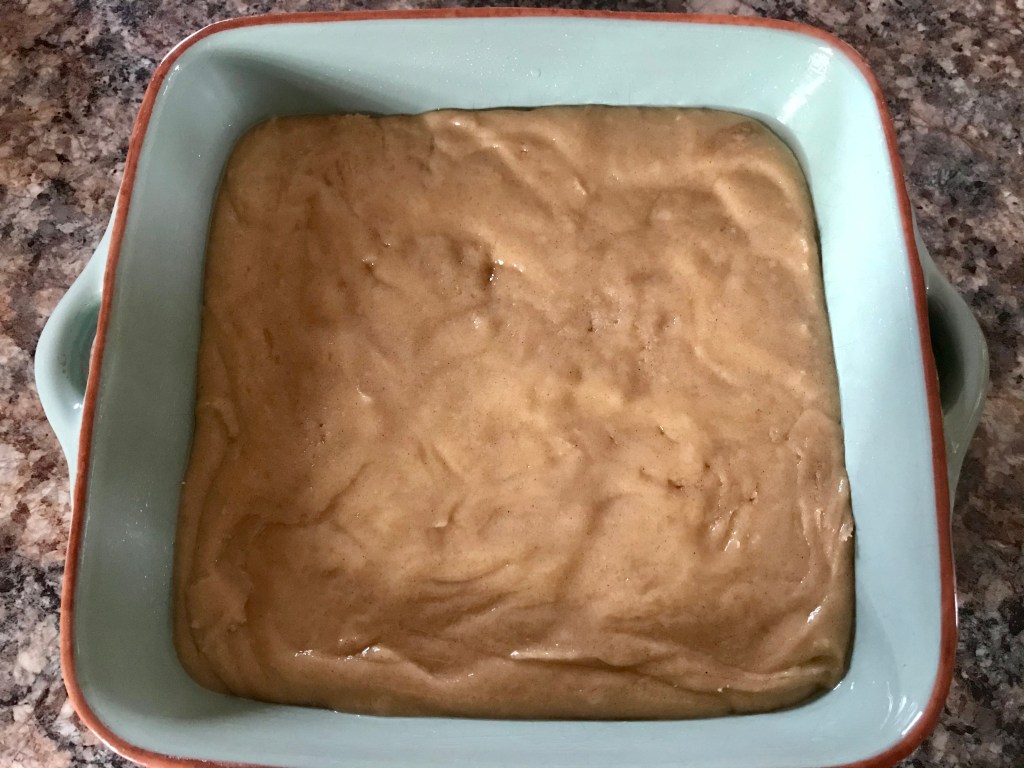 Pour the batter into a greased cake pan. This portion is not huge and in the small 9′ x 9′ pan I used, it makes a thin bottom layer. Gently pat the dough down. It is thick and settles into place fairly well.
