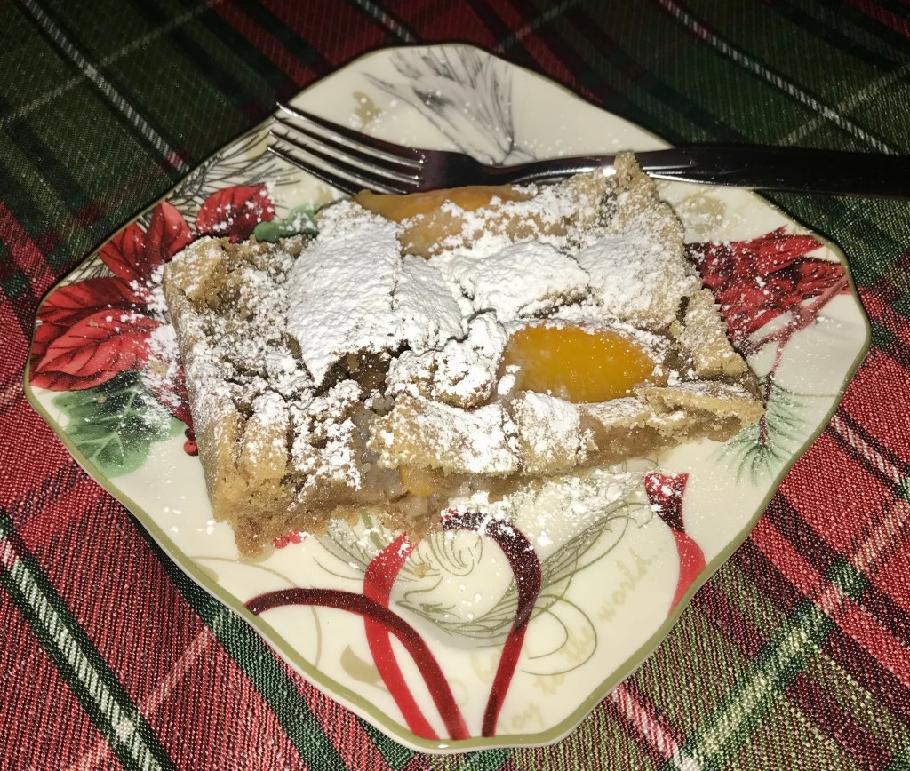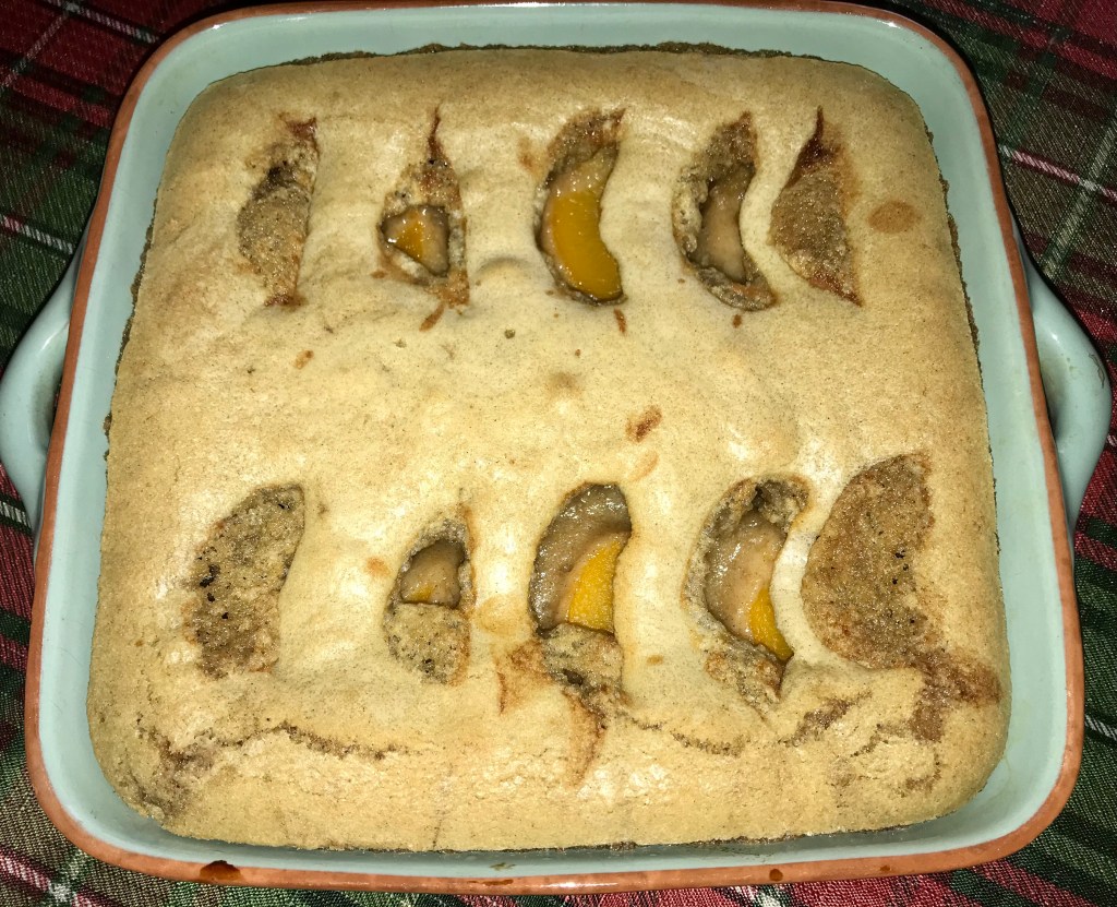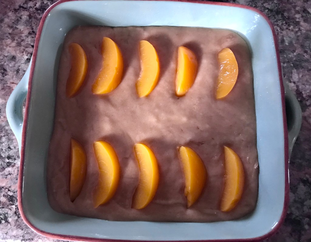 Arrange some peach slices on the top in any formation. Don’t press the fruit down. The dough will rise and cover the peaches and they will appear to “sink” a little, giving you caves where the fruit is.