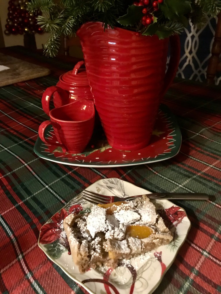 The cake doesn’t look beautiful when it first comes out. After it has cooled throughly (best when completely cooled for a few hours), dust with confectioners’ sugar to brighten it up a bit. The crust is a little hard to cut. But that is part of it’s charm. Crusty exterior and soft, gooey centre.