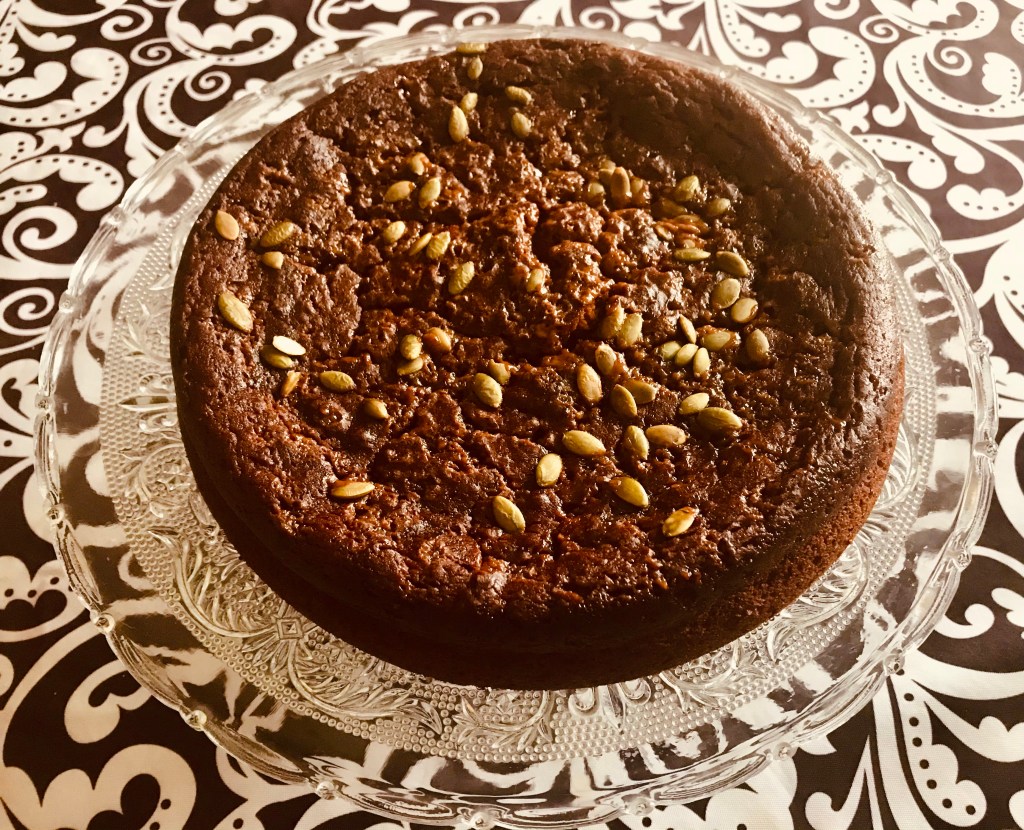 I used my round cake pan and a loaf pan and greased both well. Fill the forms you are using and pop into preheated oven for 45 minutes. I had sprinkled some Skor pieces and pumpkin seeds on top as garnish to give it a little beauty! Use a cake tester. If the cake is not done, bake for another 10-15 minutes, checking in between. I made this recipe several times. The first time it baked out just as timed. The second time my puree must have had more moisture in it. So I had to bake an hour and fifteen minutes. Every oven is different. So it is best to check once you can smell the spices as they are baking.